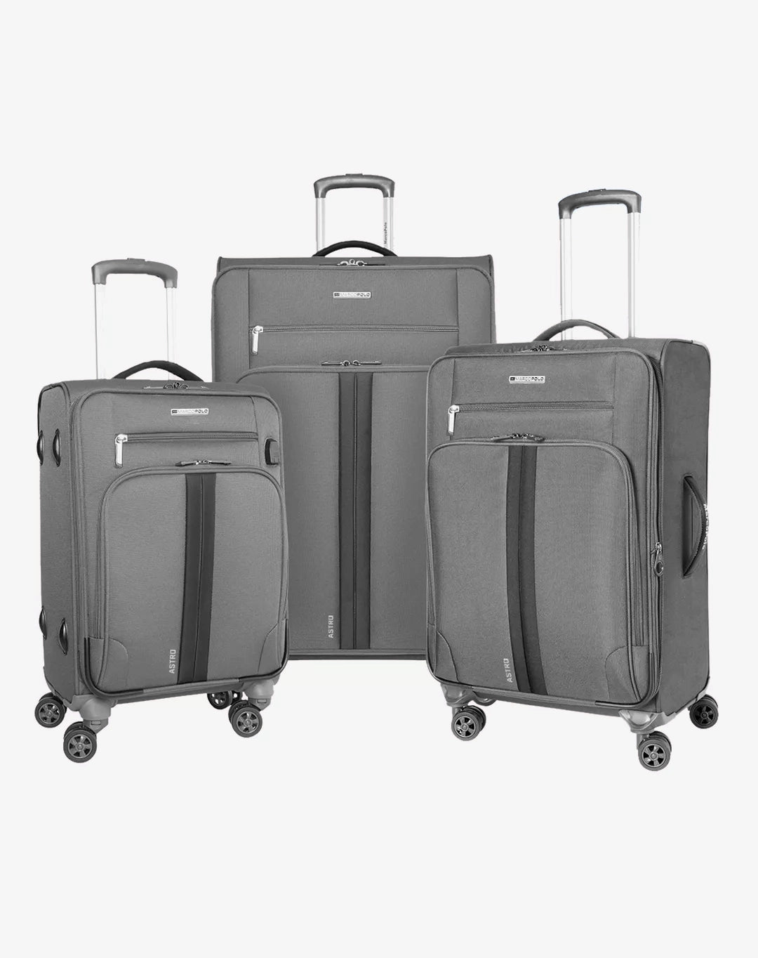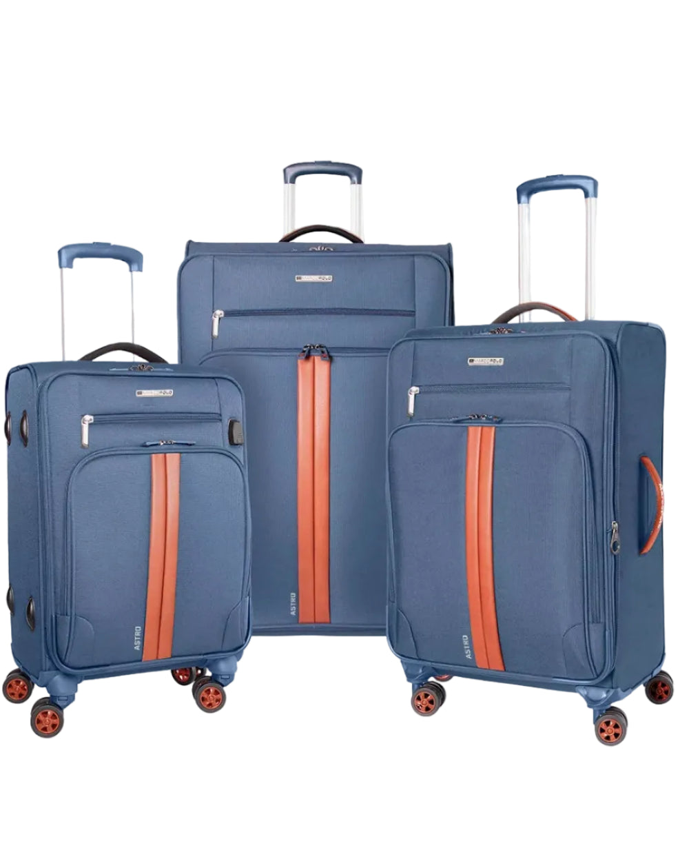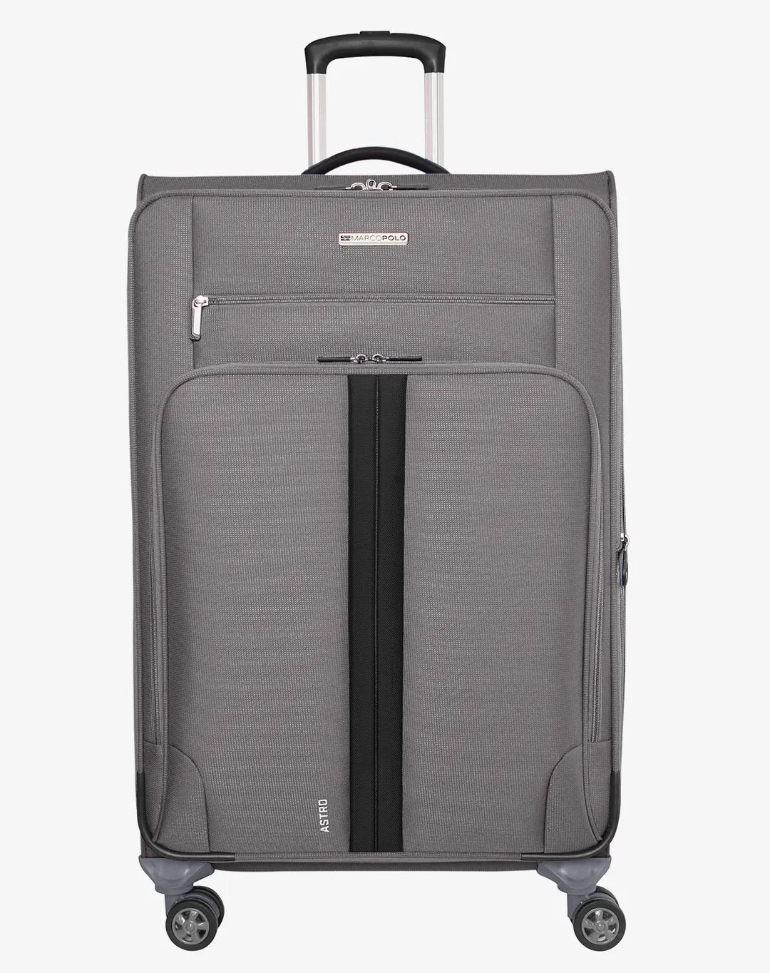 סט מזוודות רכות בעיצוב עדכני, המיועד לשימוש יום-יומי ולנסיעות בארץ ובחו"ל. סדרת ASTRO של מרקו פולו תוכננה עבור נוסעים שמחפשים פתרון אמין, קל ונוח, עם דגש על תפעול פשוט, עמידות וארגון פנימי יעיל. הסט כולל שלוש מזוודות במידות 20" 24" 28", עם נפח מתרחב, מנגנון טרולי פנימי קל במיוחד וגלגלים מסתובבים 360° לנסיעה חלקה ויציבה.