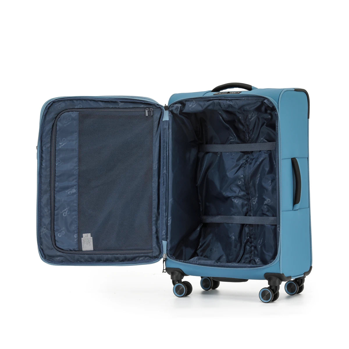 המזוודות עשויות בד פוליאסטר צפוף וחזק במיוחד בשילוב שכבת PU דוחה מים, עם גב קשיח לכל אורכן מחומרים קלים ועמידים. מערכת גלגלים כפולים עם בולמי זעזועים מאפשרת תנועה חלקה ויציבה בסיבוב 360 מעלות גם בעומס מלא.