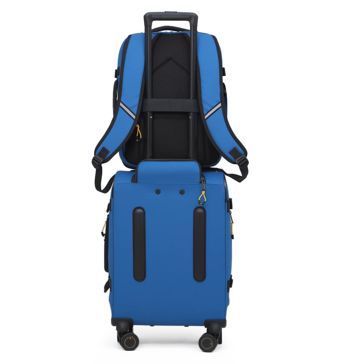 - תיק עליה למטוס עם רוכסן הרחבה - פתיחה מלאה 180° בסגנון מזוודה, תא ללפטופ, תא אחורי נסתר לדרכון, כיסים קדמיים ורצועה לחיבור לידית טרולי