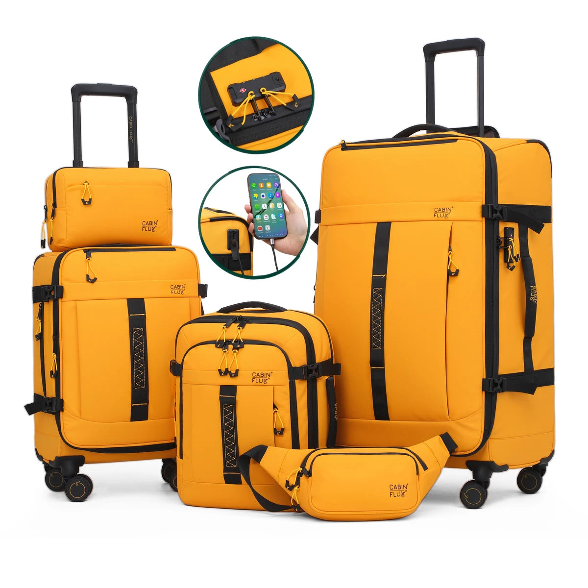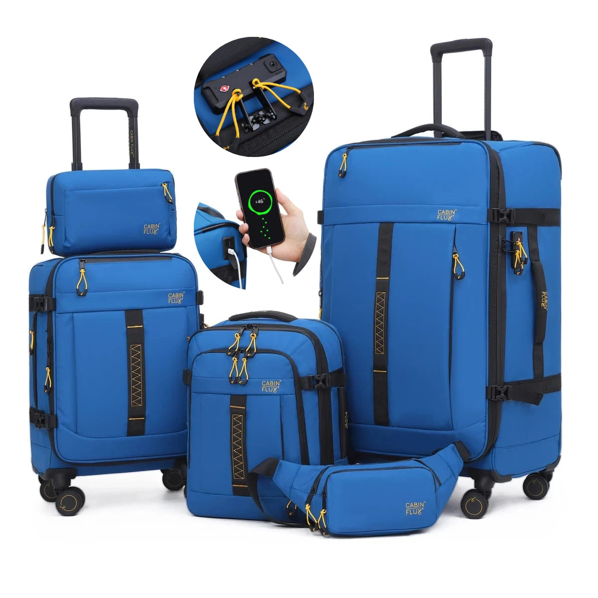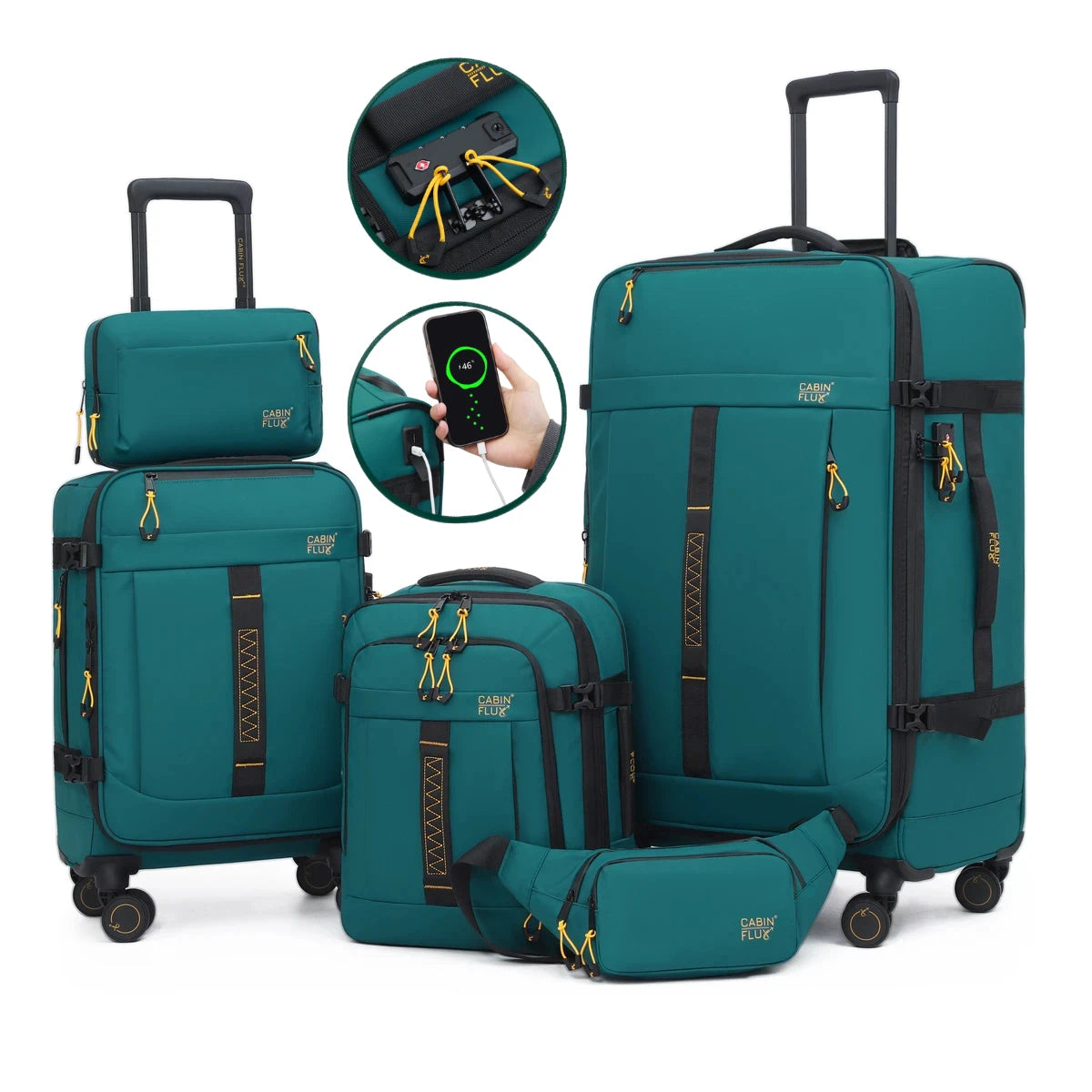 סט מזוודות 5 חלקים מסדרת הדגל של החברה הקנדית ®CABIN FLUX דגם ™Apex Ranger - הסט המושלם לנוסעים חכמים הכולל מזוודה גדולה, טרולי עלייה למטוס, תיק עלייה למטוס, תיק רחצה ופאוץ' תואם מתנה. הסט תוכנן לנוסעים המחפשים עמידות גבוהה, נוחות שימוש וחלוקה חכמה לניהול מושלם של הציוד.
